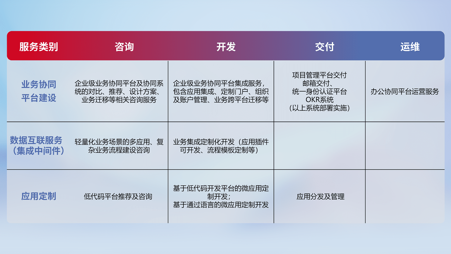 针对钉钉、、企微、、、IDaas等平台级产品提供产品的规划、、、方案、、、交付、、、、定制化开发等服务,,,,实现如统一协同办公、、、智能客户服务、、混合会议管理、、、智能数据查询、、等业务场景,,,实现数字化转型。。